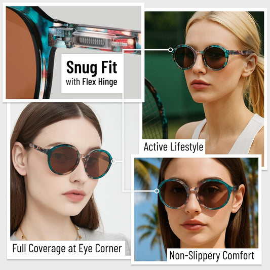 Polarized Round Sunglasses for Women – Multicolor Floral Marble Teal Frame, UV400 Protection, Retro Vintage Designer Style